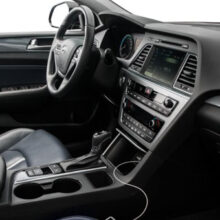 در بخش انتهای خودرو نیز، چراغهای LED عقب به همراه دو اگزور قرارگرفته در زیر دو شبرنگ و اسپویلر بالای چراغها، چهرهی سوناتا را شکیلتر کردهاند. البته فرم چراغهای خطر نیز تاحدودی یادآور طراحی کیا اپتیماست. در این بخش از خودرو نیز سیر خطوط منحنی در سپر عقب به چشم میخورد. با بررسی ویژگیهای ظاهر خارجی سوناتا، حال سری به کابین این خودرو میزنیم.