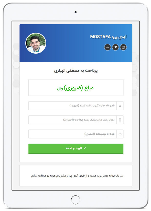 حالا درگاه پرداخت شخصی شما آماده است و با ارسال لینک آیدی پی خود به دیگران میتوانید پول دریافت کنید 🙂